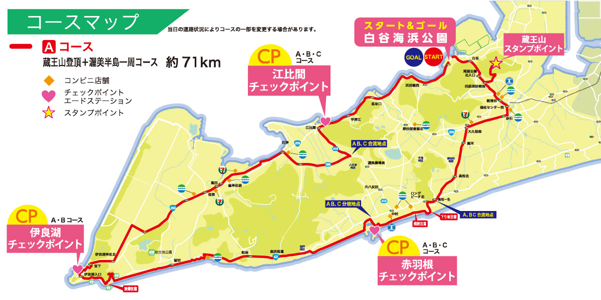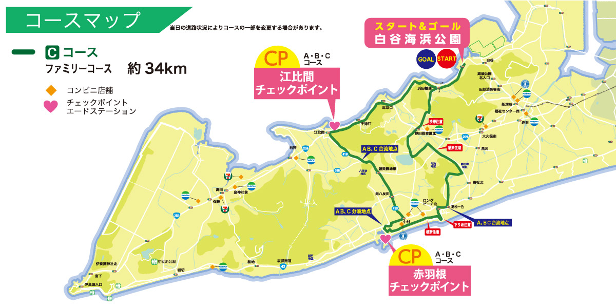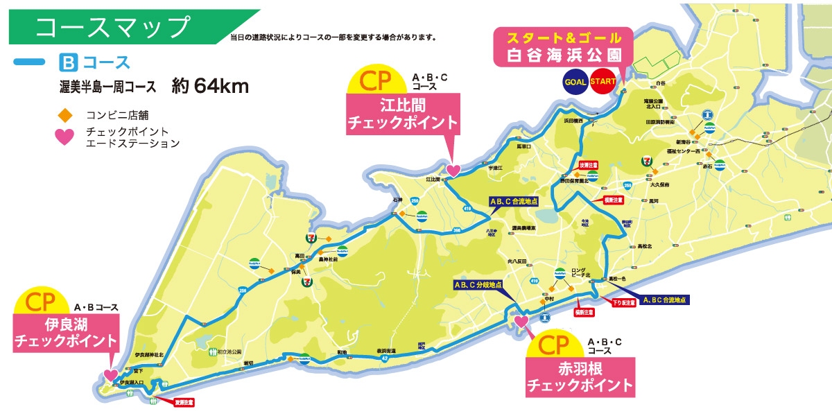 コースは赤羽根チェックポイント以降、Aコース(蔵王山登頂+渥美半島一周コース)Bコース(渥美半島一周コース)とCコース(ファミリーコース)はコースが分かれます。
